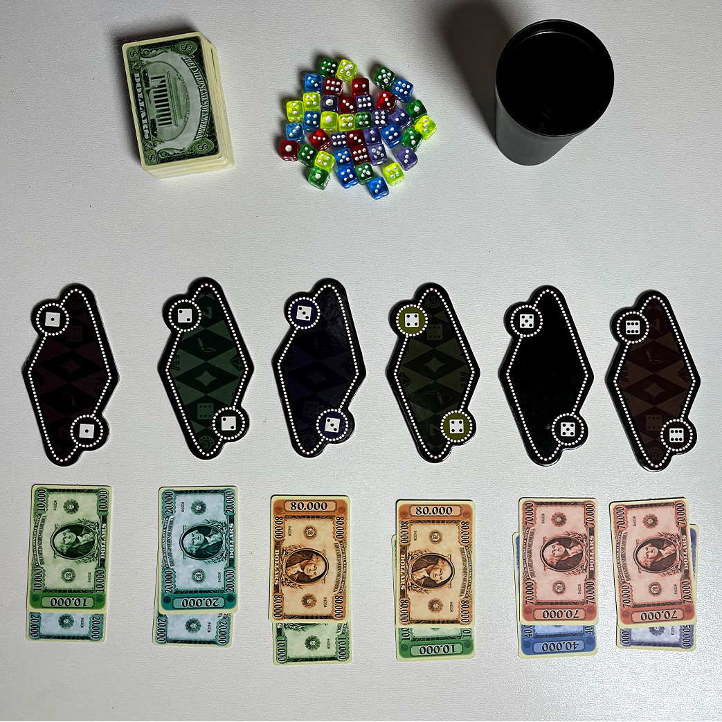 بازی فکری لاس وگاس هوشمندانه شرط بندی کنید تا با دست پر از لاس وگاس خارج شوید . شانس خود را در شش میز کازینو امتحان کنید و با غلبه بر حریفان خود پول های هر میز را از آن خود کنید. داستان بازی فکری لاس وگاس : بازیکنان در نقش قماربازان قهاری هستند که در دنیای پر زرق و برق لاس وگاس شانس خودشان را برای افزایش سرمایه خود امتحان میکنند . در هر دور از بازی تاس های خود را بریزید و تصمیم بگیرید آنها را برای کدام میز بازی می کنید. با داشتن بیشترین تاس در هر میز، پول های آن میز را بدست می آورید. در انتهای بازی بازیکنی که بیشترین پول را داشته باشد، برنده بازی است. اما مراقب باشید! بارها این رقابت بر سر بیشترین پول به درگیری کشیده شده است، تنها یک نفر است که از این درگیری با جیب پر و لب خندان خارج میشود. برنده بازی کسی است که بعد از گذشت چهار دور از بازی، بیشترین پول را به همراه داشته باشد. مشخصات و محتویات بازی فکری لاس وگاس : این بازی فکری جذاب برای 2 تا 5 بازیکن است و مناسب رده سنی +8 سال و مدت زمان برای انجام این بازی حدود 30 دقیقه است. 54 کارت اسکناس 6 تایل میز 40 عدد تاس 1 کیس تاس 1 لیوان برای تاس ریختن دفترچه قوانین بازی نحوه چینش بازی : تایلهای میز را به ترتیب عددشان مرتب کرده و در وسط میز بگذارید. 54 کارت پول را بر زده و به صورت یک دسته کارت، به پشت در کنار تایلهای میز قرار دهید; سپس دو کارت از دسته کارت برداشته و به رو مقابل خود قرار دهید. این عمل را ادامه دهید تا شش دسته کارت دوتایی داشته باشید. سپس دسته کارت با بیشترین ارزش ( مجموع دو کارت) را مقابل میز 6 قرار دهید. دسته کارت با بیشترین ارزش بعدی را مقابل میز شماره 5 قرار داده و این عمل را تا میز شماره 1 ادامه دهید. اگر مجموع ارزش دو دسته کارت یکسان بود، دسته کارتی که اسکناس با ارزشتری دارد اولویت دارد. اسکناسهای باقی مانده را به پشت به کنار بگذارید تا در دورهای بعدی از آنها استفاده کنید. نحوه انجام بازی : بازی در چهار دور انجام میشود، هر دور شامل چهار تا شش نوبت تاس ریختن به ازای تعداد بازیکنان میشود. بازیکن بزرگتر بازی را آغاز میکند و سپس بازیکنان به صورت ساعتگرد بازی را ادامه میدهد. در نوبت خود، تمام تاسهای باقیمانده خود را بریزد ( در نوبت اول هشت تاس و با گذست نوبتها کمتر و کمتر). برای اینکار تاسها را درون لیوان ریخته، لیوان را تکان دهید و تاسهایی که عدد انتخاب شده را نمایش میدهند را میز متناظر قرار دهید ( اگر در آن میز، از قبل تاسهای حریفان شام و یا حتی تاسهای خودتان وجود داشت باز میتوانید تاسهای خود را در آن میز قرار دهید). تاسهای باقی مانده خود را از محفظه تاس خارج کرده و لیوان را به همراه محفظه در اختیار بازیکن بعدی قرار دهید. بازیکنان بعدی مراحل را به همین شکل اجرا میکنند تا همه بازیکنان همه تاسهای خود را مصرف کنند.